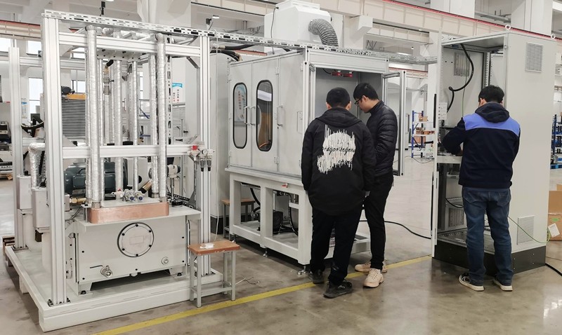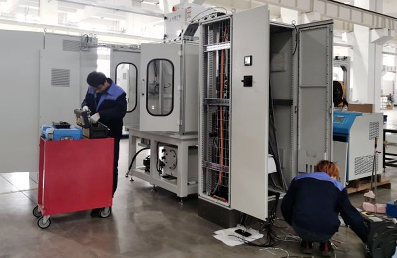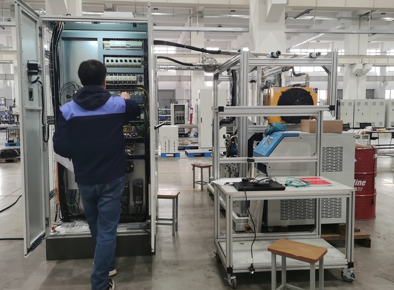 設(shè)備機(jī)身主要包含機(jī)身框架組件,測試工裝,設(shè)備罩殼組件,臺架內(nèi)部油箱組件(油泵吸油油箱),臟油箱(回收臺架內(nèi)部的測試油液,包含循環(huán)過濾組件),液壓站;測試工裝用于油泵的定位夾緊,工裝上包含油泵的進(jìn)、出油口及伺服驅(qū)動(dòng)電機(jī)組件;液壓柜包含儲油箱,油箱加熱系統(tǒng),過濾系統(tǒng)及壓力流量采集組件。